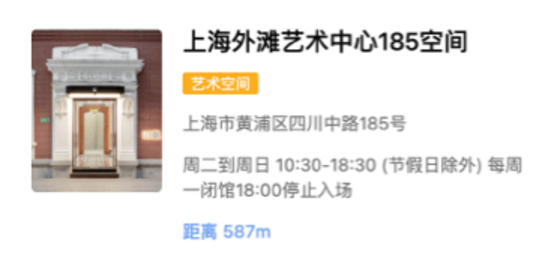 上海外滩艺术中心185空间是正在建设中的外滩艺术中心首个向公众开放的当代艺术空间,空间坐落于上海外滩历史风貌核心区的四川中路185号,距离外滩水岸约400米。建筑距今已有120年历史,为文艺复兴府邸式的优秀历史建筑。空间拥有五个展厅和一个多功能厅,展示面积逾600平米,在保留历史原貌的同时又注入了当代气息,展品与建筑在此共同叙事并由此产生呼应与共鸣。未来,空间将携手顶尖艺术家为大众奉献具有学术和市场双重影响力的重要展览及相关活动,带领公众领略当代艺术的多元图景。